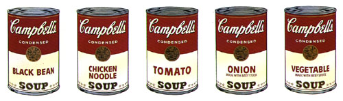 La reproduction ci dessus est une œuvre d’Andy Warhol (surnommé le Pape du Pop), caractéristique du Pop’art. Il expose ici plusieurs modèles de boîte de soupe Campbell, objet standardisé produit en masse et uniquement destiné à la consommation.