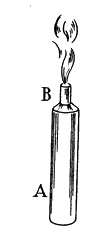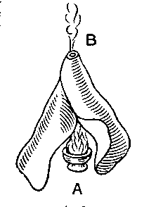 Cela ne peut pas être affirmé sans réserves de tous les liquides trouvant accès dans les pores d’autres corps. Car les particules d’esprit de nitre, si elles pénètrent dans les pores d’un papier blanc, le rendent raide et cassant ; on peut en faire l’expérience en versant quelques gouttes sur une capsule de terre portée au rouge, telle que A, et en s’arrangeant pour que la fumée s’échappe à l’ouverture d’un cornet de papier B. Il faut observer en outre que l’esprit de nitre ramollit le cuir sans le mouiller, au contraire le cuir se contracte comme sous l’effet du feu.