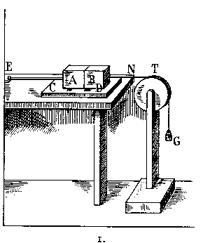 Soit, dans la figure 1, CD une surface plane polie avec le plus grand soin, A et B deux morceaux de marbre appliqués l’un sur l’autre. Le marbre A est fixé par le milieu à un crochet E, B attaché à une corde ; T est une poulie, G un poids qui montre quelle force est nécessaire pour écarter le marbre B du marbre A suivant une ligne parallèle à l’horizon.